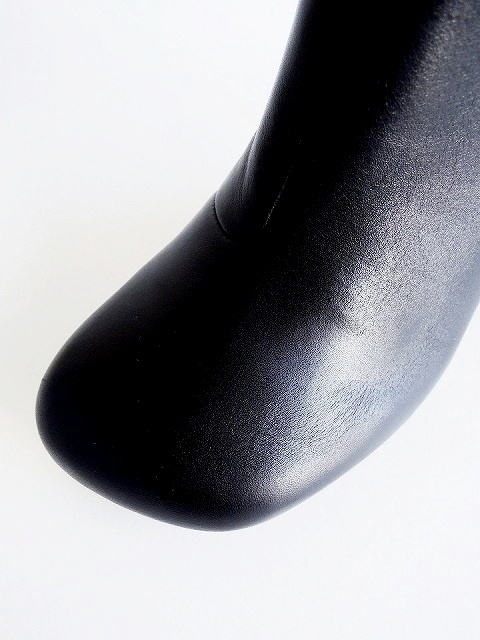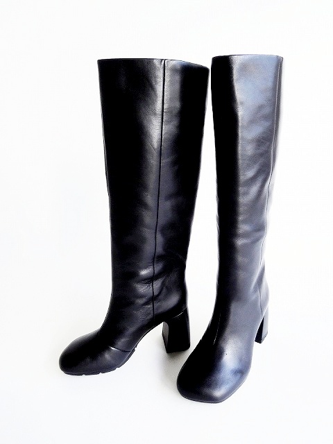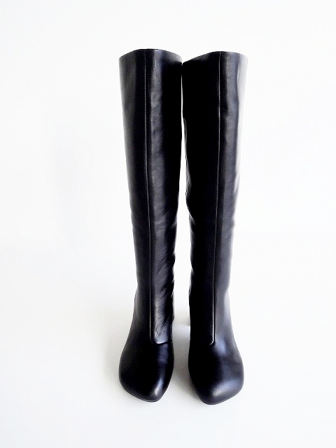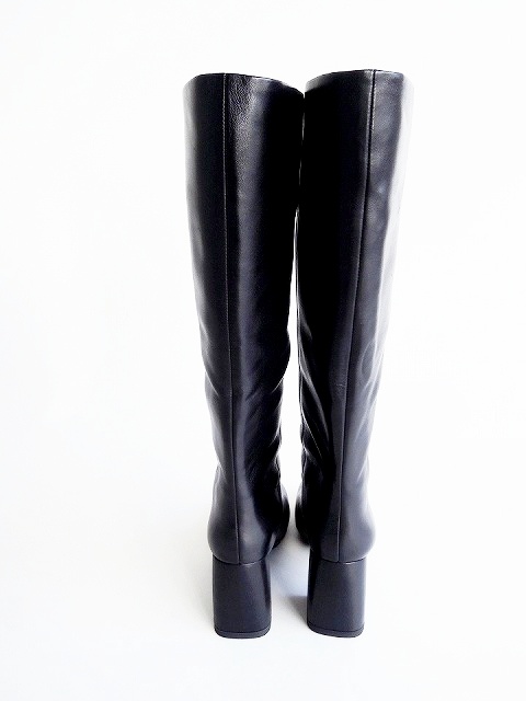 ・艶感のあるブラックレザーに、ストレートのフォルムがモードな雰囲気に仕上がったチャンキーヒールロングブーツ。