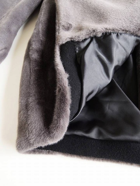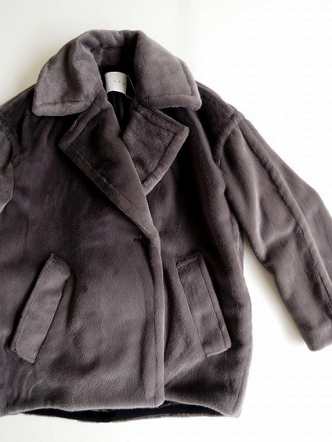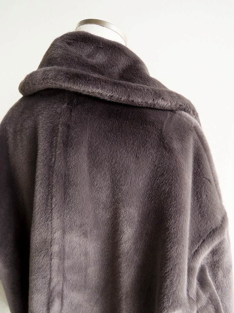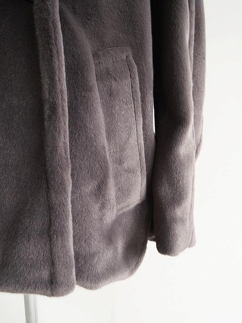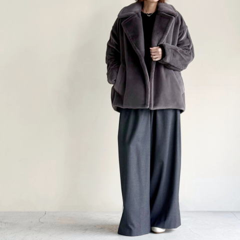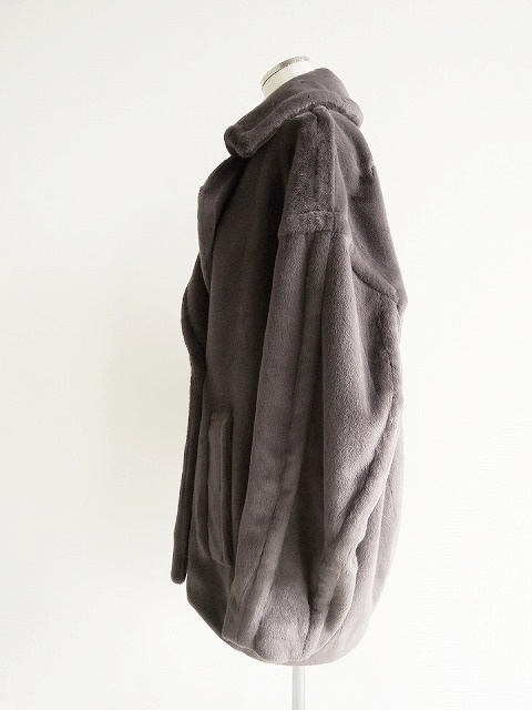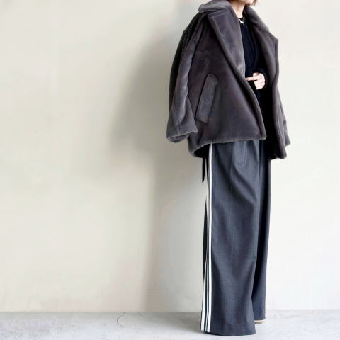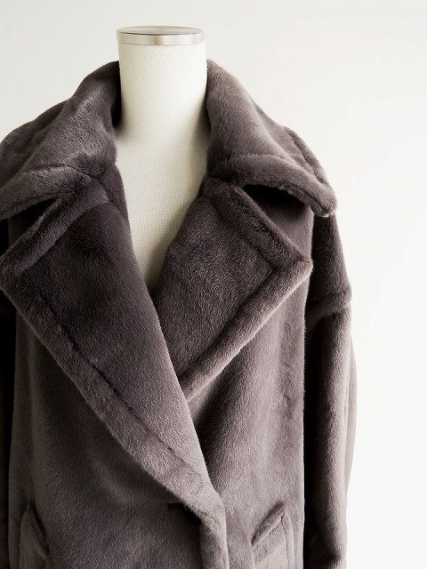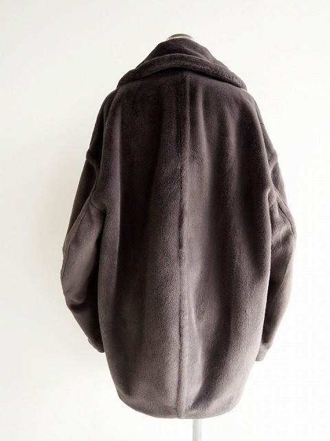 ・リサイクルポリエステル100%素材を後染めし、適度な長さの毛足で滑らかな風合いと適度な光沢ある表面感に仕上げたコート。