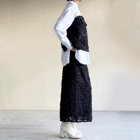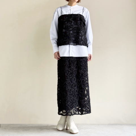 ・チュールをベースにテープをタック状に寄せながらロゼット調の刺繍を施したキャミソールブラウスは、華奢なストラップとコンパクトなシルエットで女性らしく着こなせる一着。