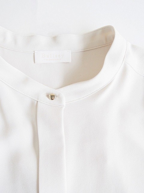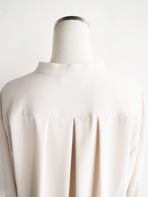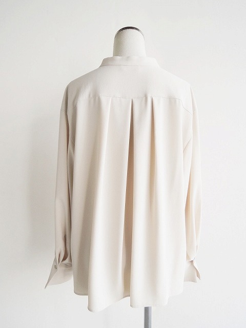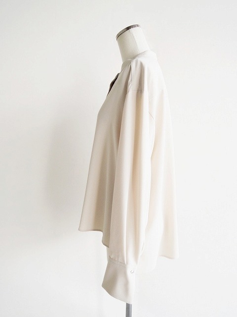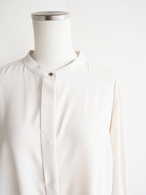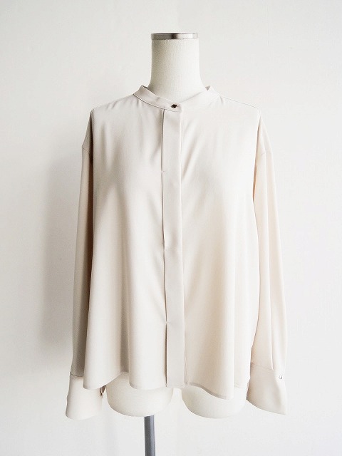 ・しなやかな落ち感、とろみのあるドレープ性が魅力的なポリエステルジョーゼット素材のブラウスは、首元に沿うスタンドカラーにボックスシルエットでクリーンな印象に。