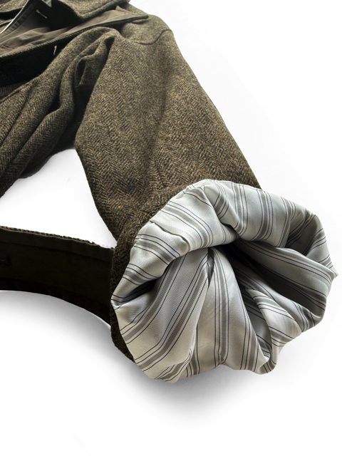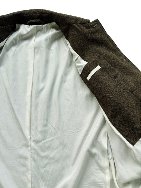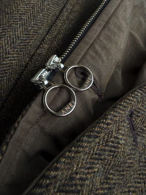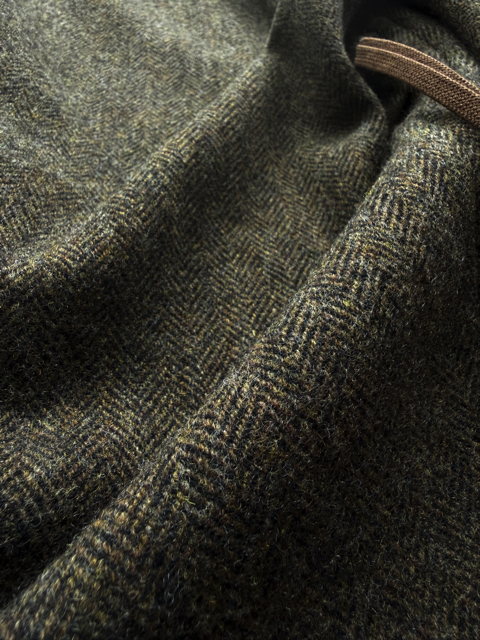 尾州産地にて織り上げた紡毛ツイード素材使用。ヘリンボーン織柄の新色。