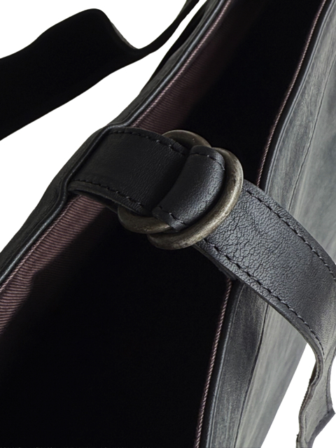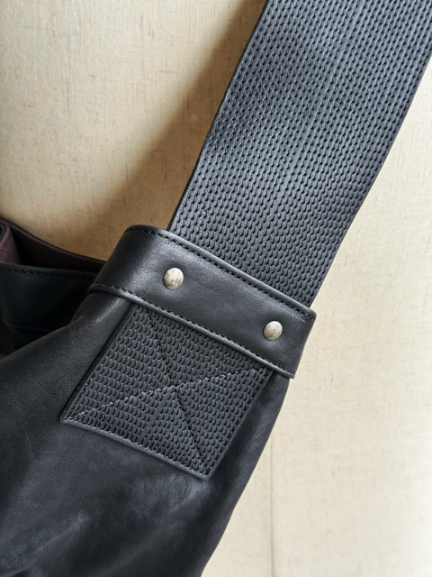 ショルダーハンドルのステッチを敢えてランダムな間隔で入れ、