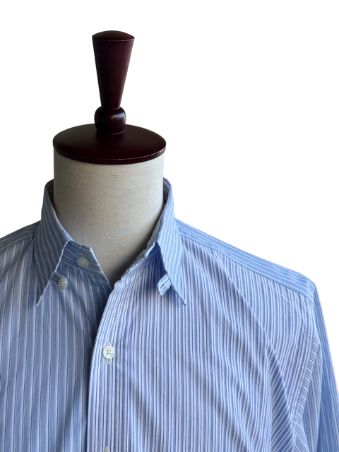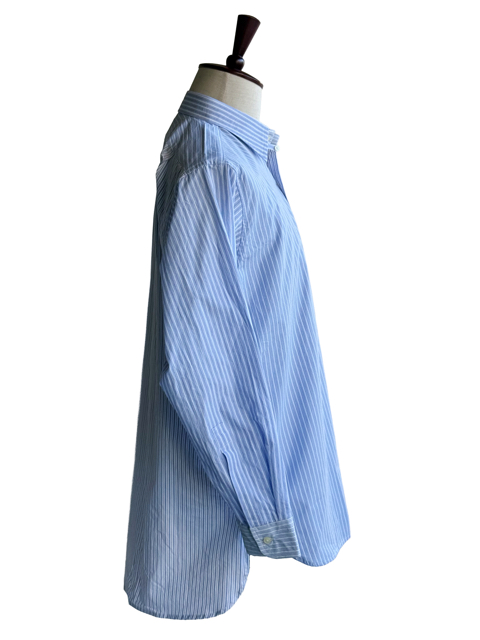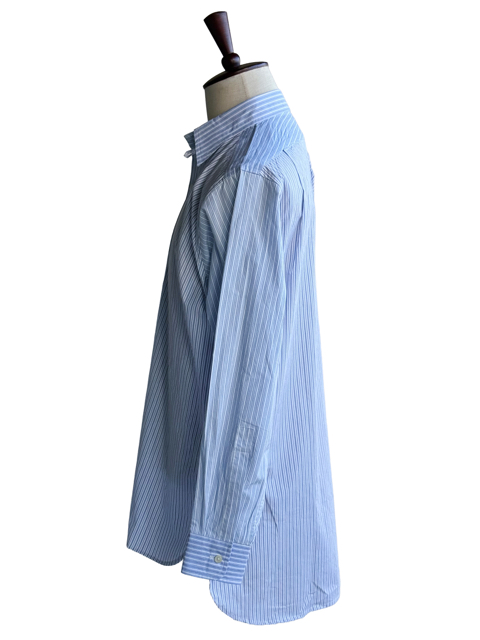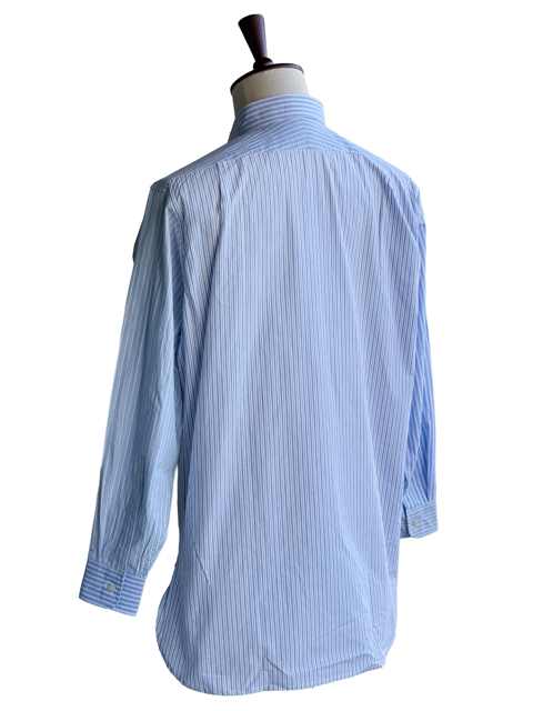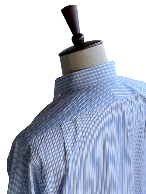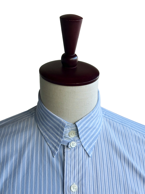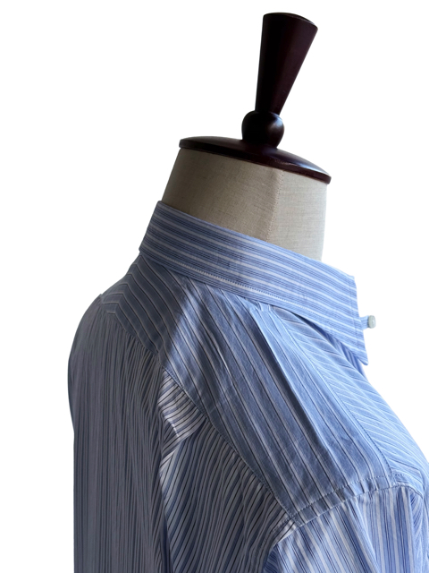 ハリ感のあるコットンタイプライターのストライプ生地を使用したタブカラーシャツ。