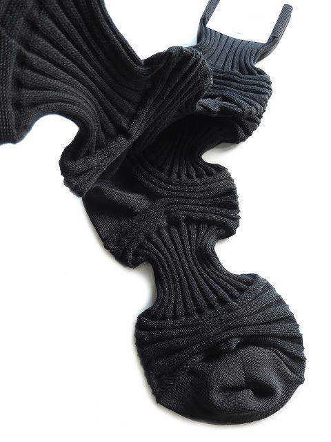 横に突っ張る性質のガーターと、横に縮む性質のあるリブを交互に組み合わせたユニークなシルエットのソックスです。