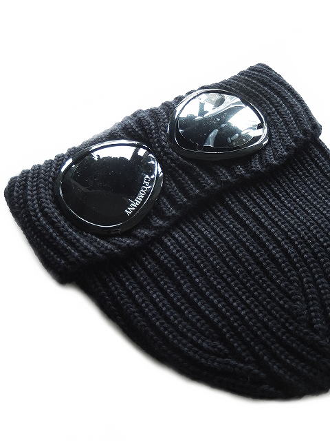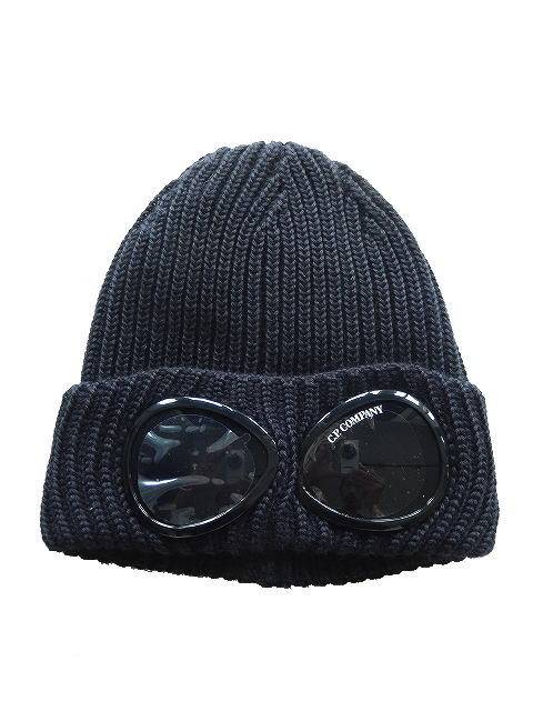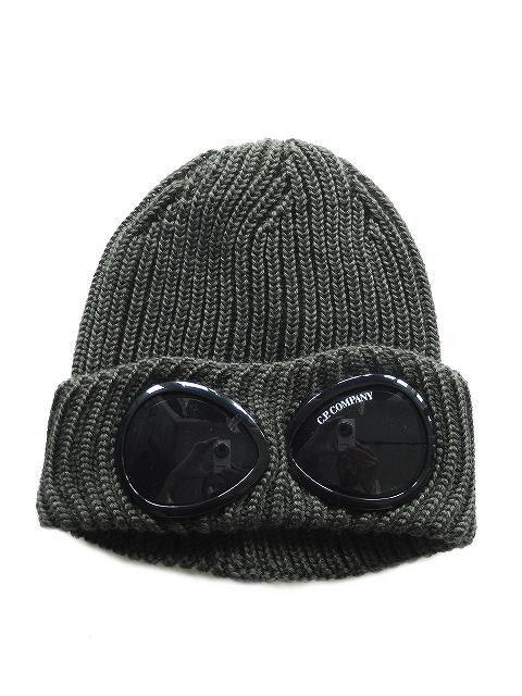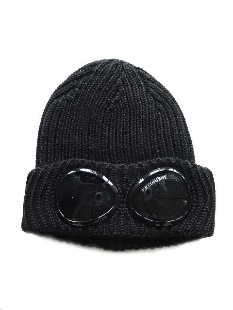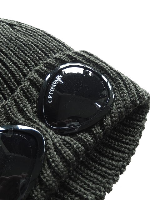 リブ編みニット、折り返しのつば、C.P.カンパニーのアイコンであるゴーグル・レンズが特徴。