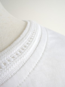 襟元のニットのパイピングにも透かし柄が入っていて他にはないデザイン。
