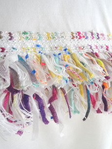 マルチカラーのカラフルでボリュームあるフリンジが目を引くTシャツ。