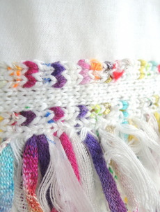 マルチカラーのカラフルでボリュームあるフリンジが目を引くTシャツ。