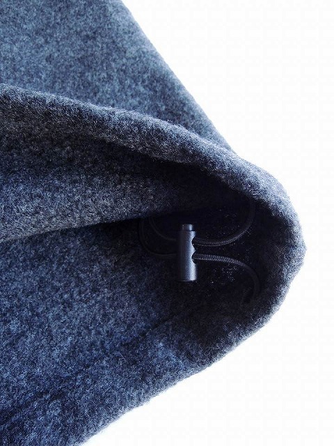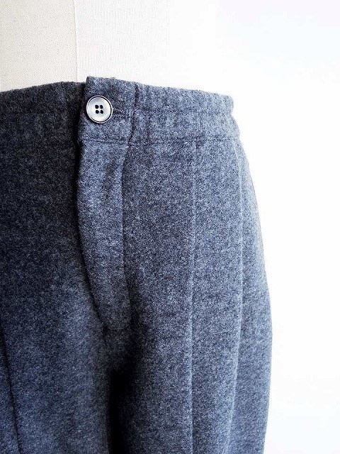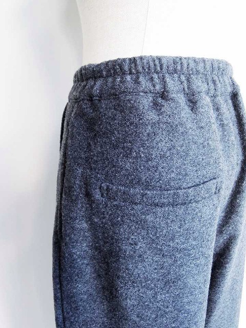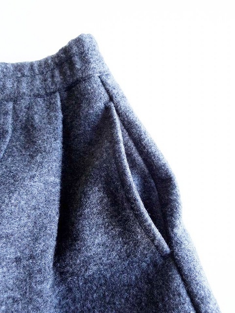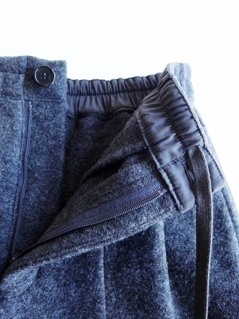 ・ウールリングの生地に圧縮をかけ独特な表情に仕上げ、密度が高まることで暖かさと軽さを兼ね備えたパンツ。