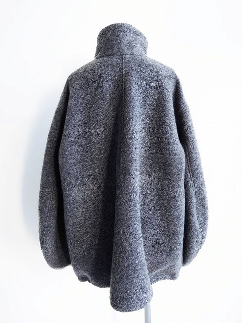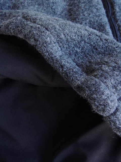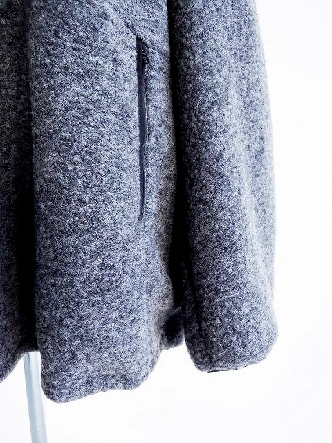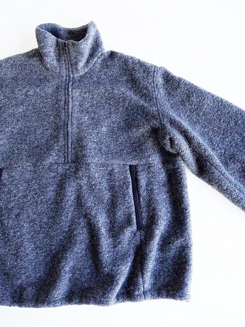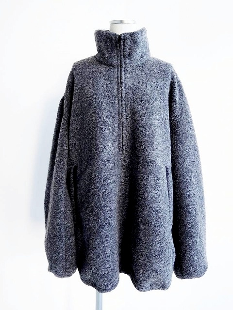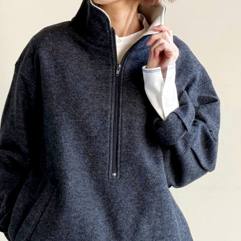 ・ウールリングの生地に圧縮をかけ独特な表情に仕上げ、密度が高まることで暖かさと軽さを兼ね備えたハーフジップトップス。
