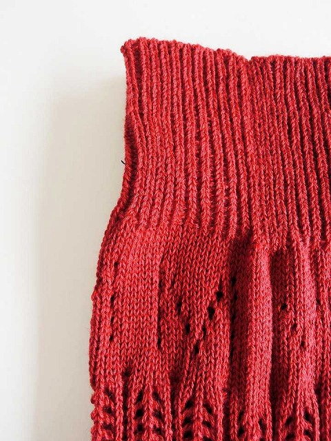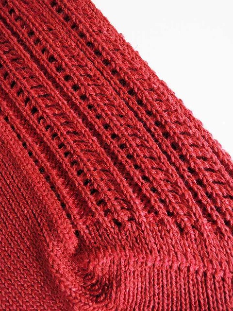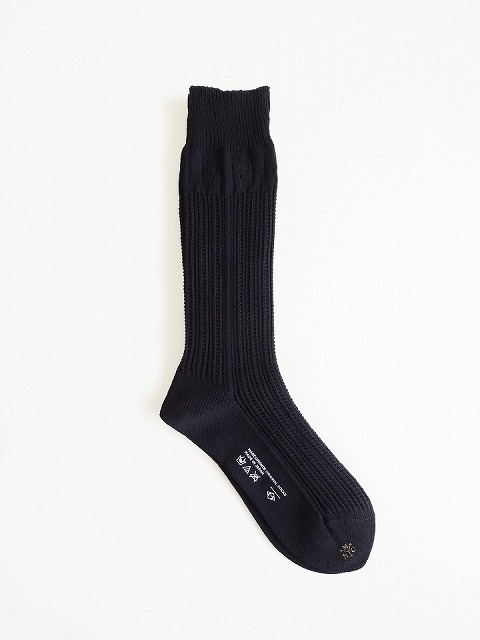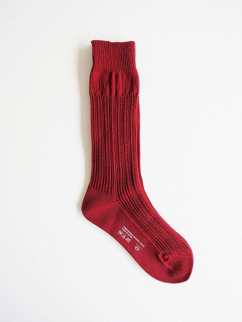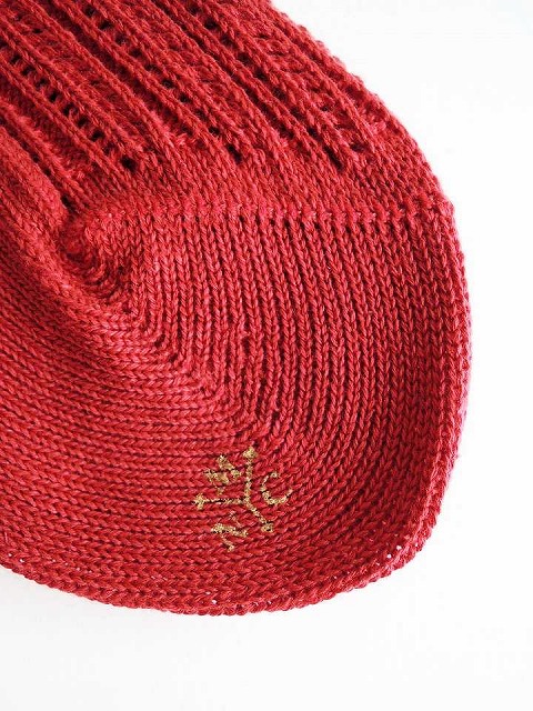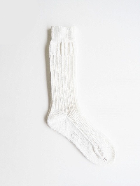 | ・ホールガーメント製法で仕立てた立体感ある編み地に、履き口下の「M」の透かし模様がさりげなく入ったコットンリネンソックス。 |