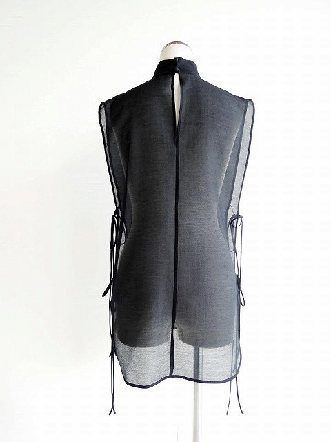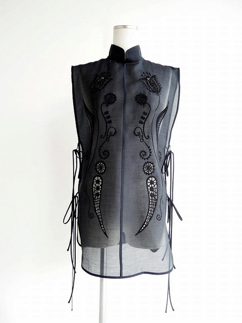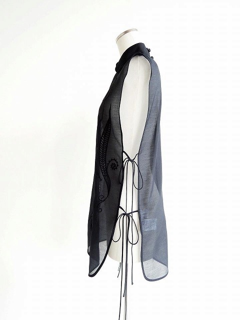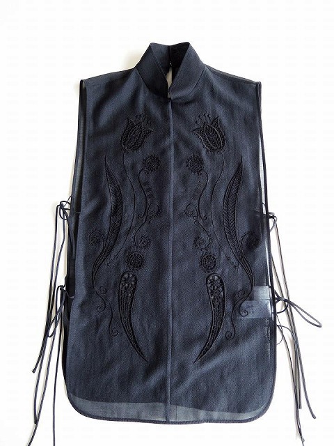・程よい透け感が印象的な刺繍ベストは表面にシボ感を出し、染色後にエアータンブラー加工を施すことで風合い豊かに仕上がっています。