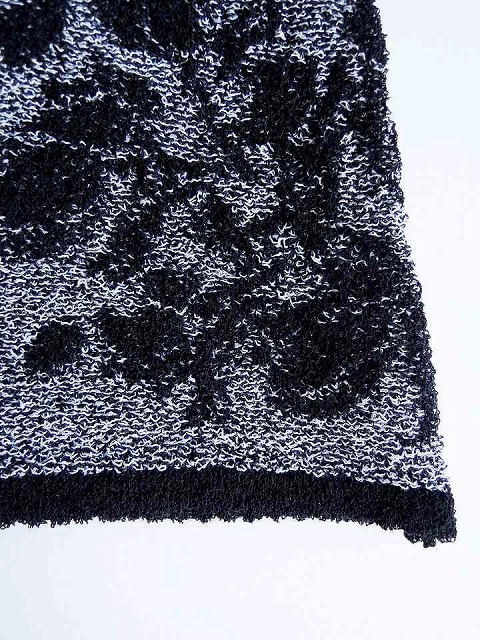 ・綿とナイロンの混紡のデニット糸とホワイトチタンのラメ糸を使用することで磨りガラスのような表面の凹凸と柔らかなフィット感が優しく身体に沿う。