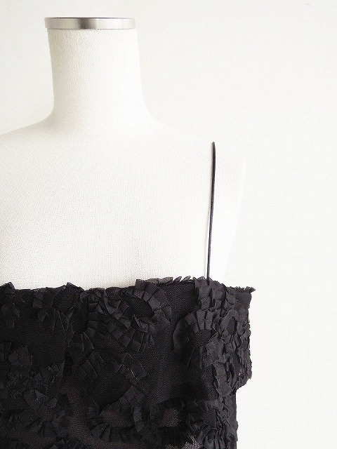 ・チュールをベースにテープをタック状に寄せながらロゼット調の刺繍を施したキャミソールブラウスは、華奢なストラップとコンパクトなシルエットで女性らしく着こなせる一着。
