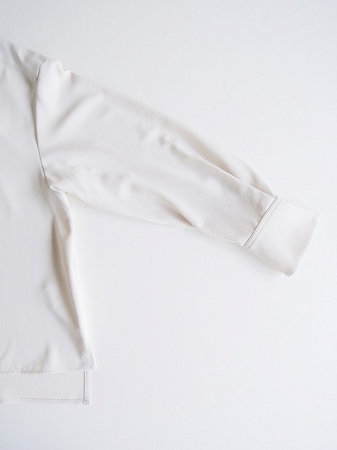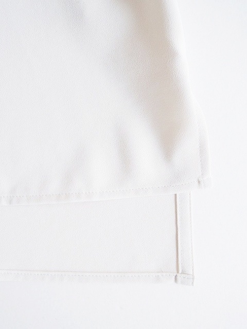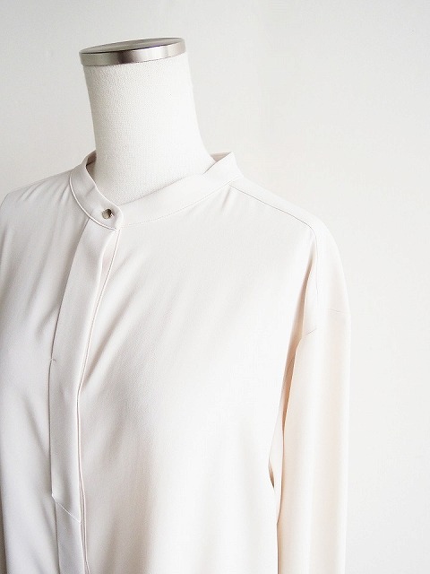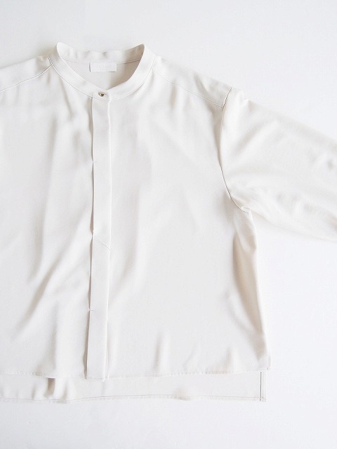 ・しなやかな落ち感、とろみのあるドレープ性が魅力的なポリエステルジョーゼット素材のブラウスは、首元に沿うスタンドカラーにボックスシルエットでクリーンな印象に。