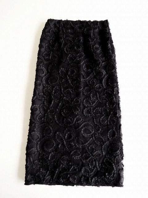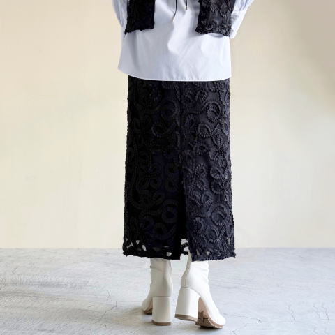 ・チュールをベースにテープをタック状に寄せながらロゼット調の刺繍を施したスカートは、素材を引き立たせるシンプルなタイトシルエットに仕上げています。