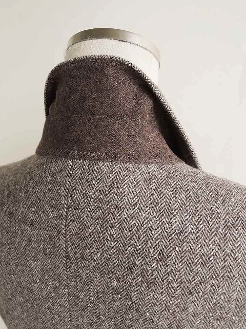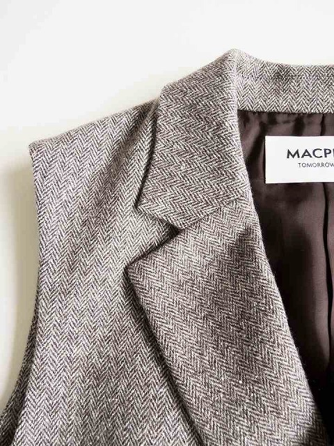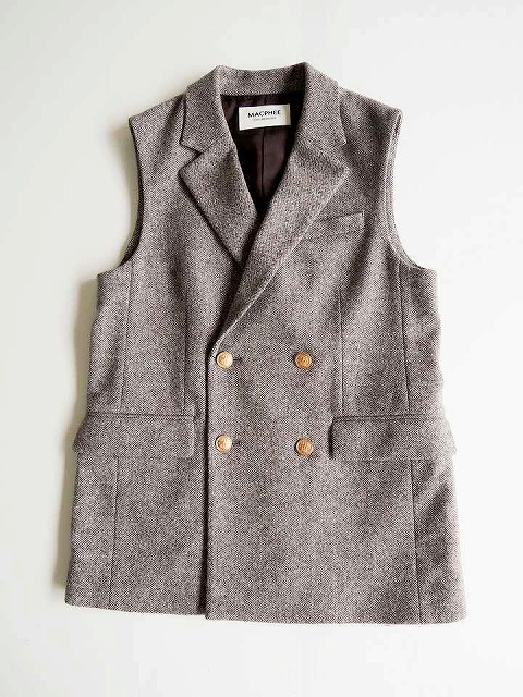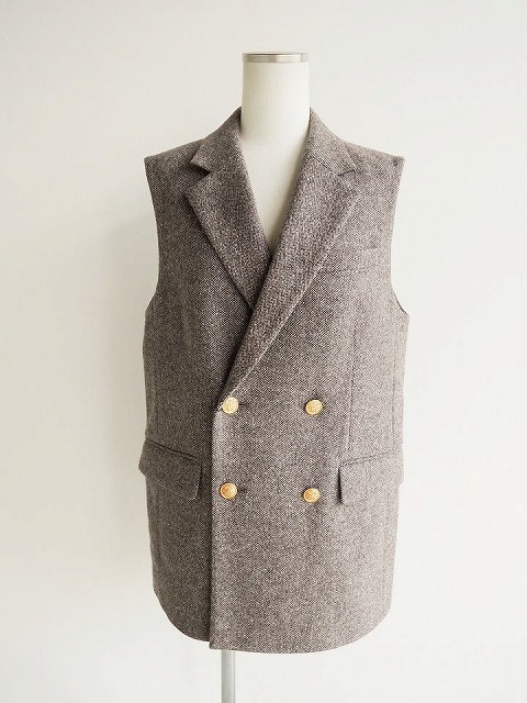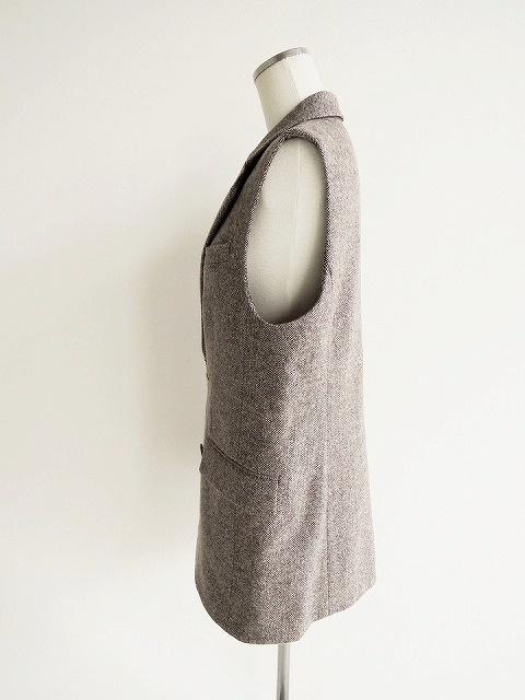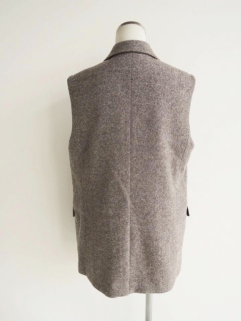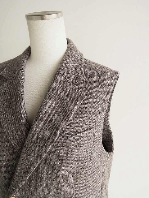 ・タテ糸にシルクネップ糸、ヨコ糸にトップ糸を使用し織り上げ、ミルド加工を施すことで適度なウォーム感がありながらもチクチク感を感じづらいツイード素材のジレ。
