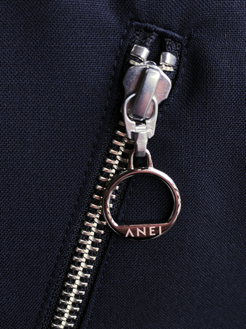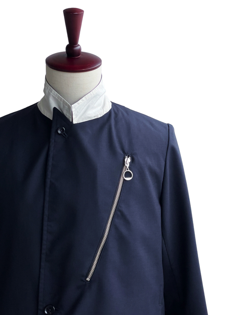 襟裏の配色生地、ファスナーポケットが特徴です。