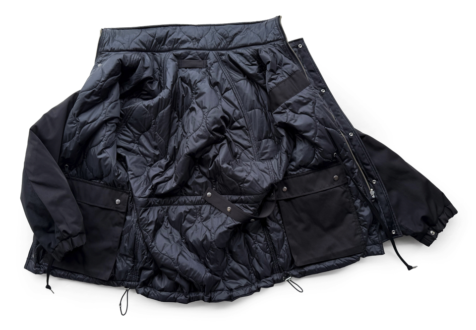 ウエストにコード、裾にはスピンドル&ストッパーを配置しシルエットの調整が可能。