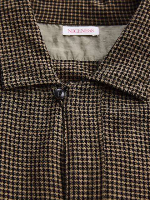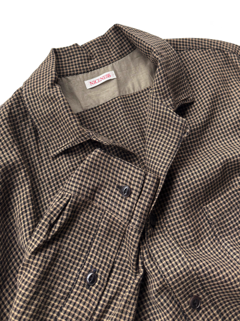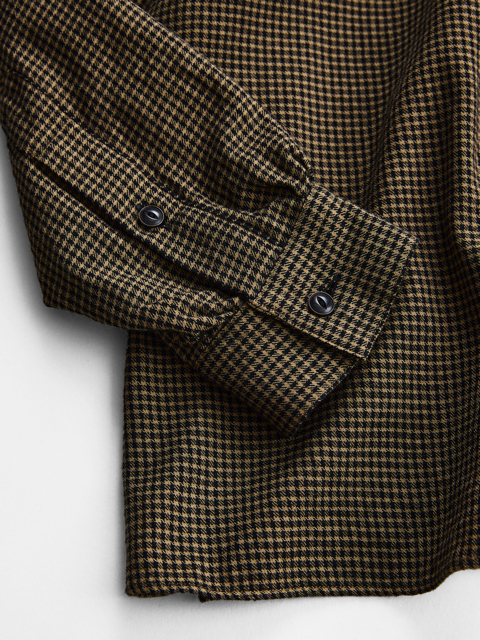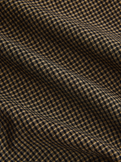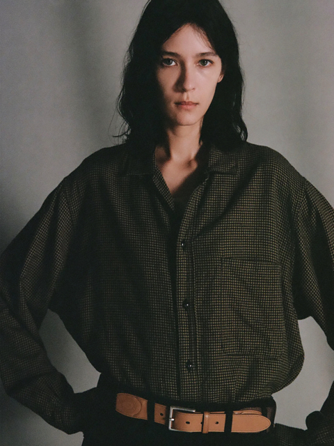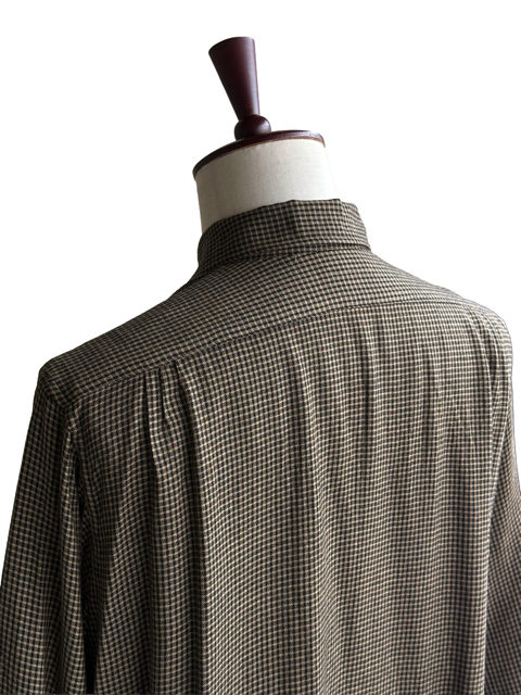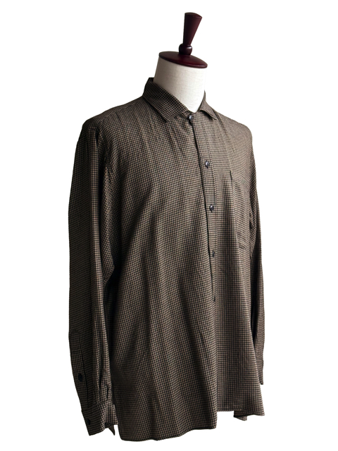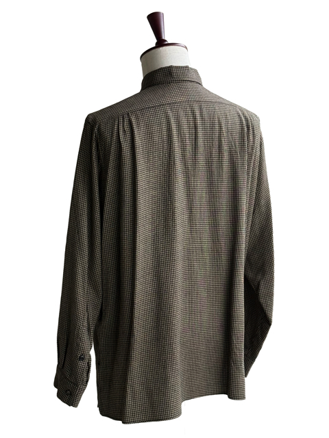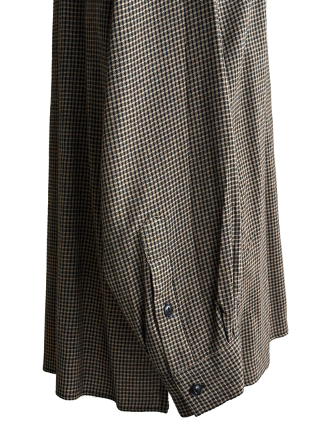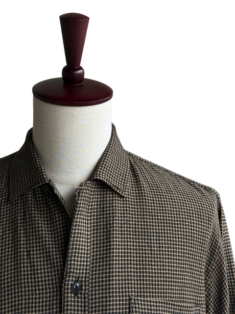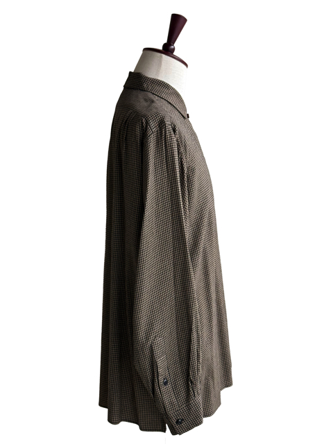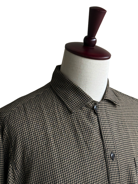 Super140'sの原料を⽤いたツイルチェック⽣地で製作したオープンカラードレスシャツ。