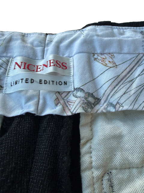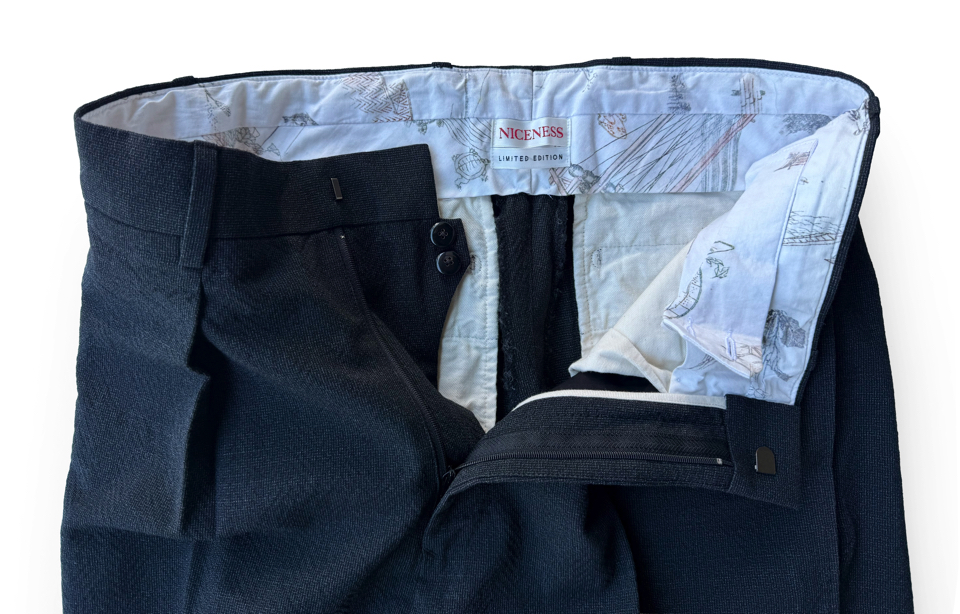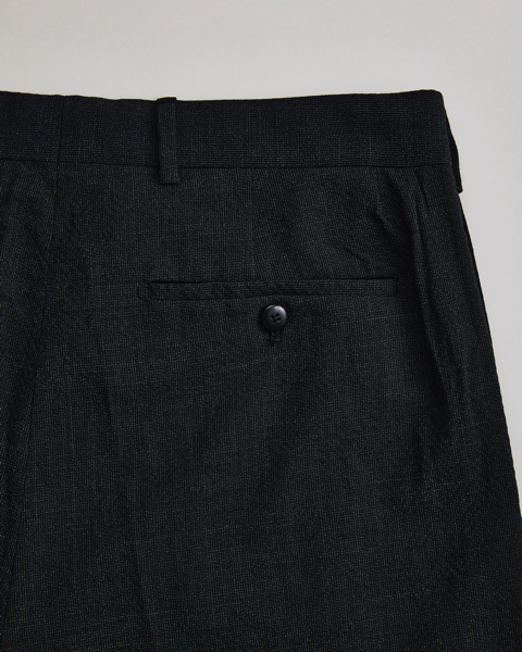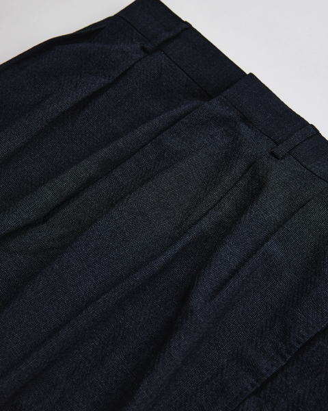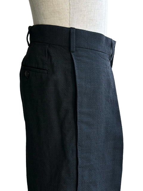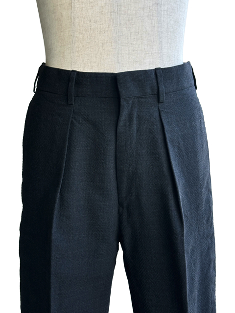 Z撚り平織りヘリンボーン⽣地で製作したフライングVトラウザー。