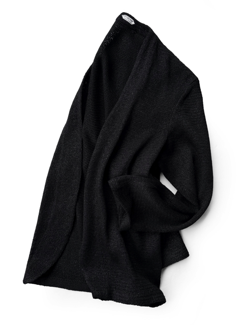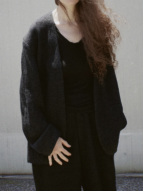 シンプルなノーカラージャケットは、 ボタンレスでも首、肩回りが抜けにくく