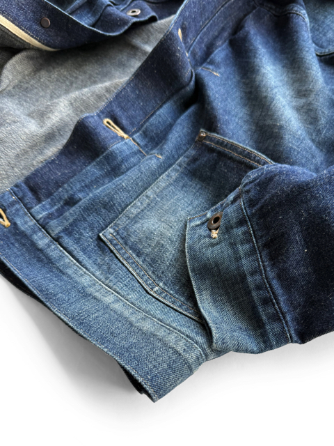 セルヴィッジを使 用したヴィンテージデニムジャケットは、生地幅が狭いため、