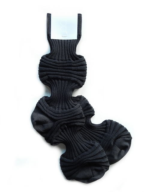 横に突っ張る性質のガーターと、横に縮む性質のあるリブを交互に組み合わせたユニークなシルエットのソックスです。