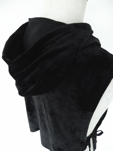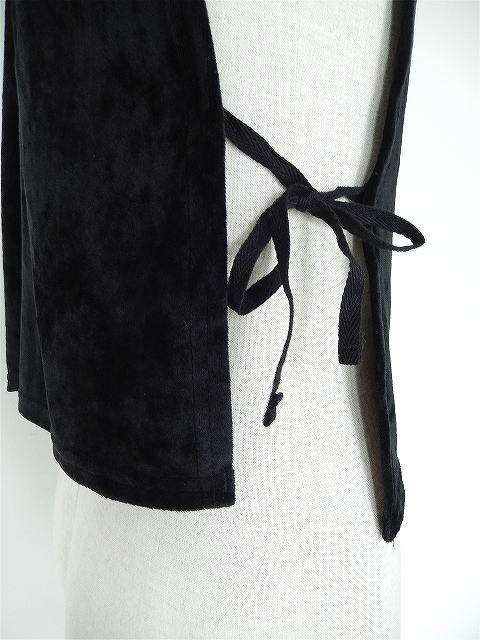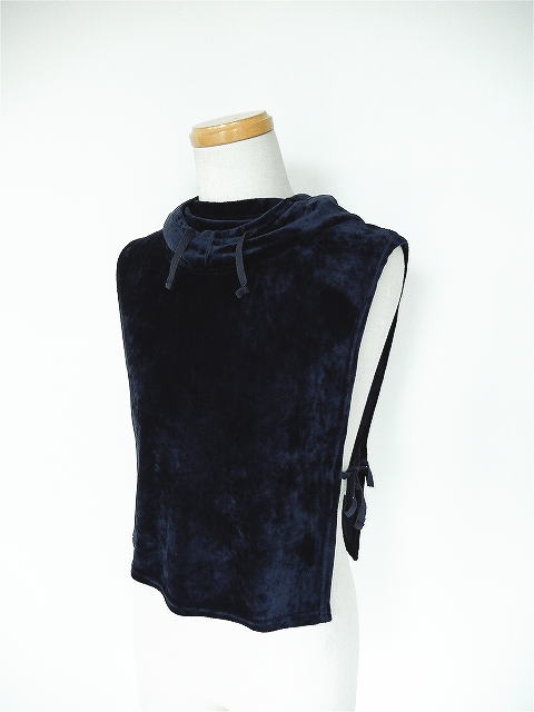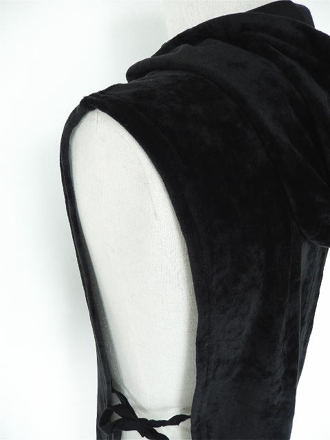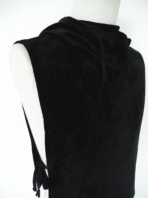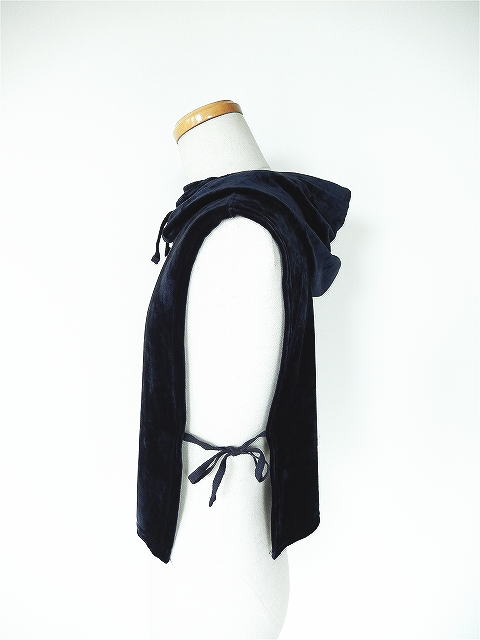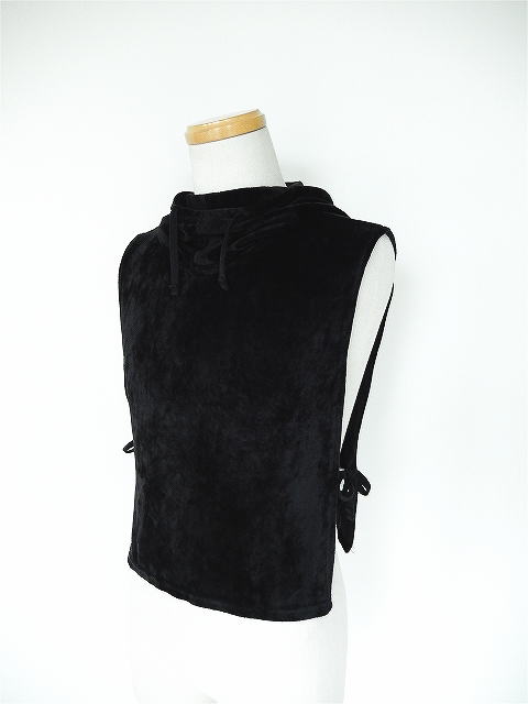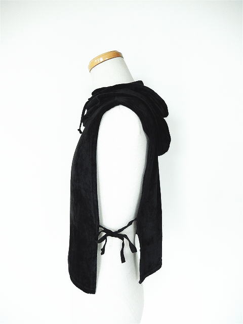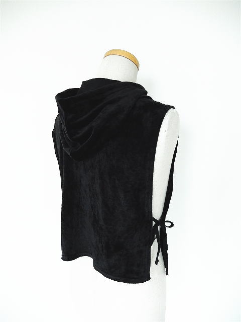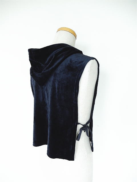 プルオーバーのフーディベストのようなデザインで、サイドは紐留めで着用するインナー向けのレイヤードアイテムです。
