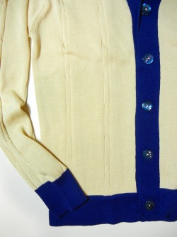 ・さらりとした薄手のコットンニットを使用したカーディガン。 ベースカラーに対してのBLUE の太めのパイピングが