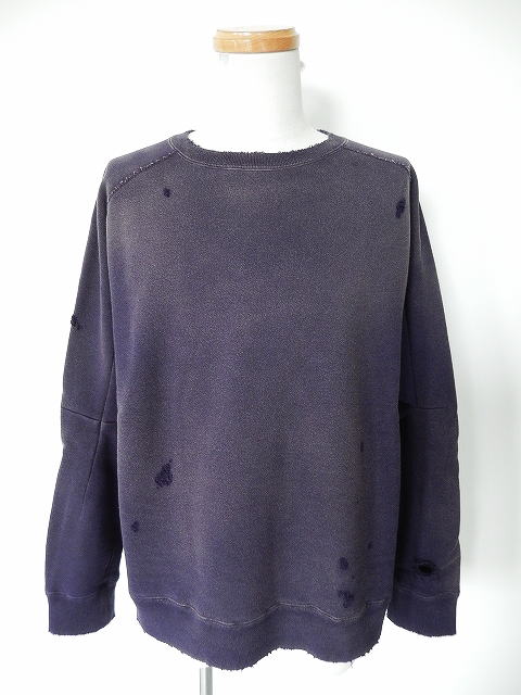 ヴィンテージスウェットのようなリアルなダメージや色褪せの加工が施されたスウェットシャツ。