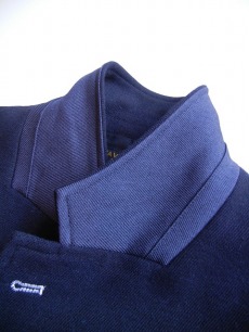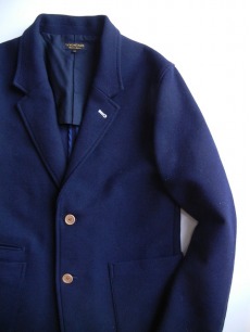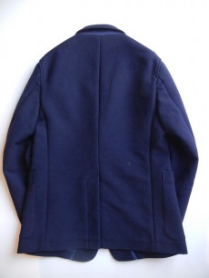 A VONTADEよりWool jersey club jacketのご紹介です。 オリジナルで作成したニットライクなコットン/ウール地を使用したクラブジャケット。 タテ糸にトップの綿糸を使い、ウールの糸2本とストレッチの糸1本を交互にヨコ糸を打ちかえることで、 表にはウール、裏には綿とストレッチの糸が廻るよう織られています。 ウールの糸とストレッチの糸の縮率差によりニットライクな生地に仕上がっており、 素材のイメージに合わせて、着丈はやや長めに、ゴージラインも低めに設定して、 やや着崩したイメージで、肩肘を張らずに切れるジャケットを目指してつくられました。 裏地の付かない一枚仕立てで、背裏をフラシでつけた、総パイピング仕上げ。 ラペルのホールは生成りの糸でアクセントに。