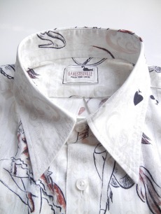 さらさらとした着心地の良いコットンストライプドビー生地に、総柄でオリジナルプリントを施したオープンカラーシャツです。