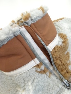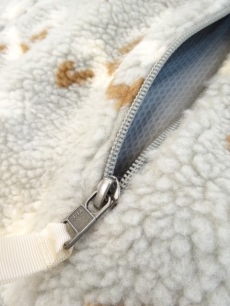 防風性メンブレンを貼り合わせたポリエステル100%(リサイクル・ポリエステル50%)使用シェルパ・フリース製。