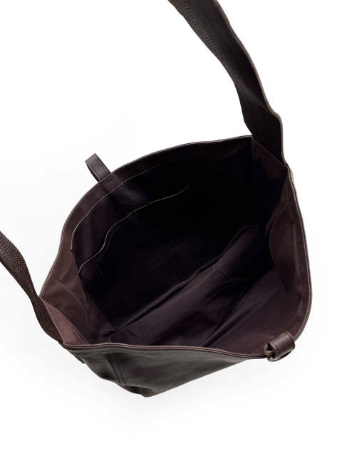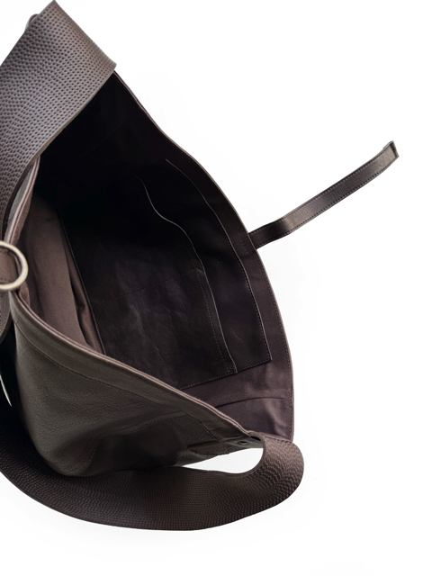 ショルダーハンドルのステッチを敢えてランダムな間隔で入れ、
